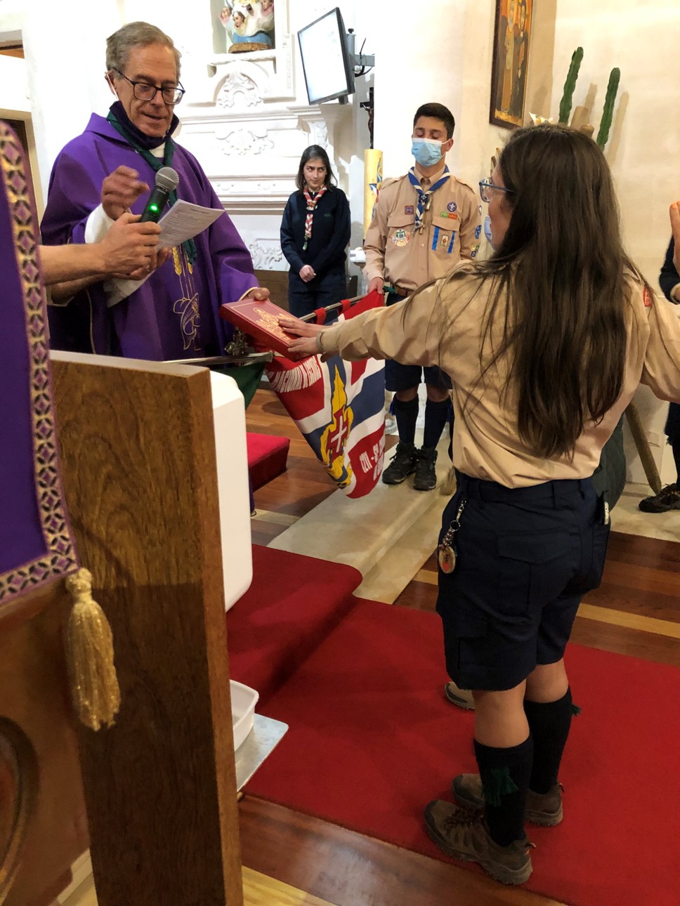 Assistente: Recebei este lenço como sinal da decisão de assumirdes o vosso compromisso baptismal, como educadores e evangelizadores no Escutismo Católico Português.